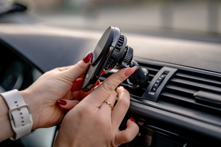 - Umieść ładowarkę z uchwytem na kratce wylotu powietrza.